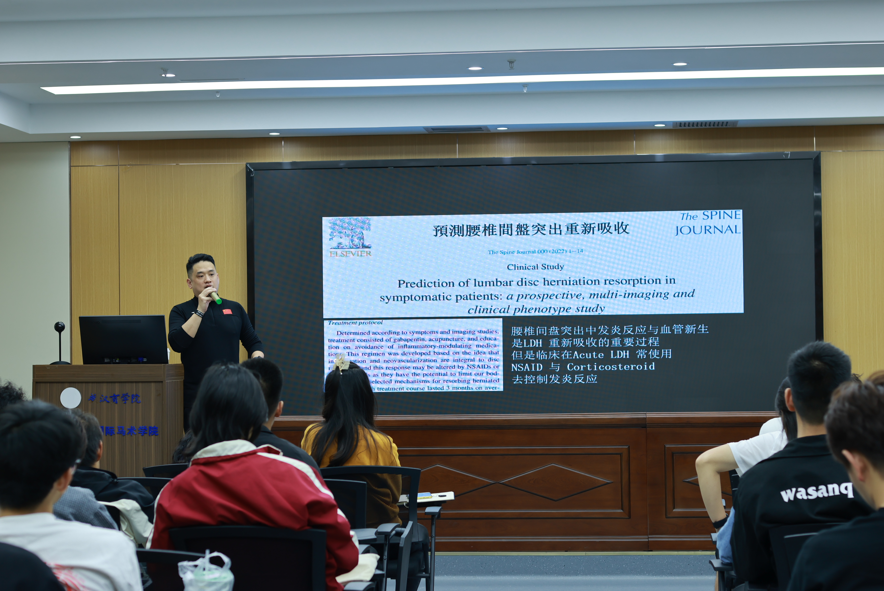 本次讲座,邱博士通过“全麻下腹腔镜探查与小肠粘黏松解术”“腰椎后路减压椎体融合手术”“腰椎间盘突出”等案例讲解,阐述了运动医学诊所康复物理治疗早期加速外科康复的发展趋势和治疗理念。同时,邱博士对运动康复行业的发展现状、运动康复师的职业定位等结合自己的学习工作经历做了详细介绍,希望同学们能结合目前的课程学习和实践经历在专业学习上做得更细、更深,他的分享对pg电子官网运动康复专业各年级同学都极具启发和教育意义。