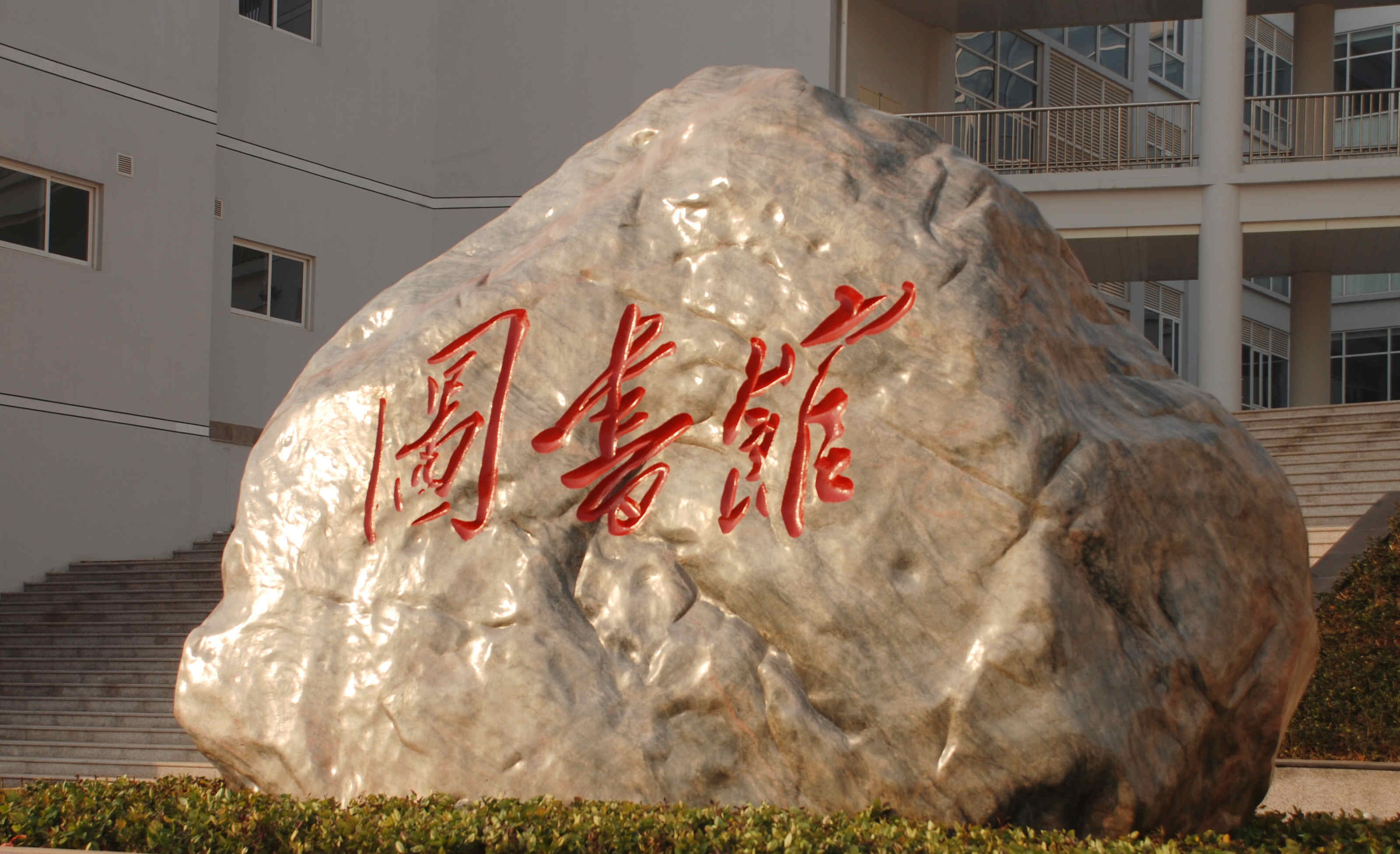 图书馆前,横卧一块硕大的“三峡石”,上面篆刻朱色毛体大字——“图书馆”。在阳光的映照下,这几个字显得遒劲、飘逸。据介绍,这块石头重43吨,高4米,宽5米,是用大吊车专门吊到这里的。石头外表光滑,有着漂亮的底纹,显示出浓厚的文化气息。