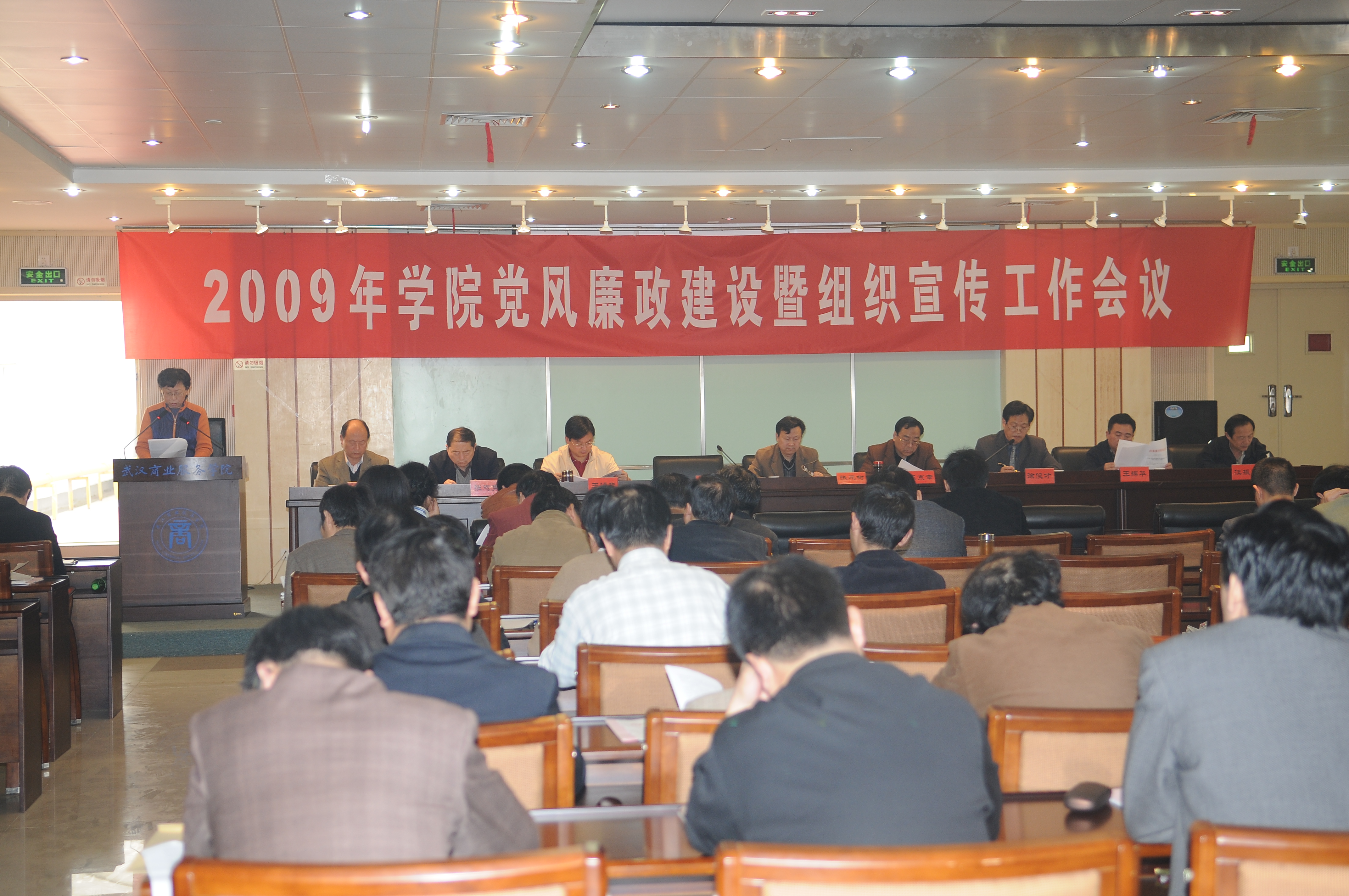 3月19日,学校党风廉政建设、组织宣传工作会议在北综多功能厅召开。会上,组织人事部、党委宣传部、纪委监察处负责人宣读了2009年工作要点,各部门签订了《党风廉政建设责任书》。学校中层干部参加会议,校领导张元树、王京章、徐俊才、王清华、王辉华、张志勇出席会议。