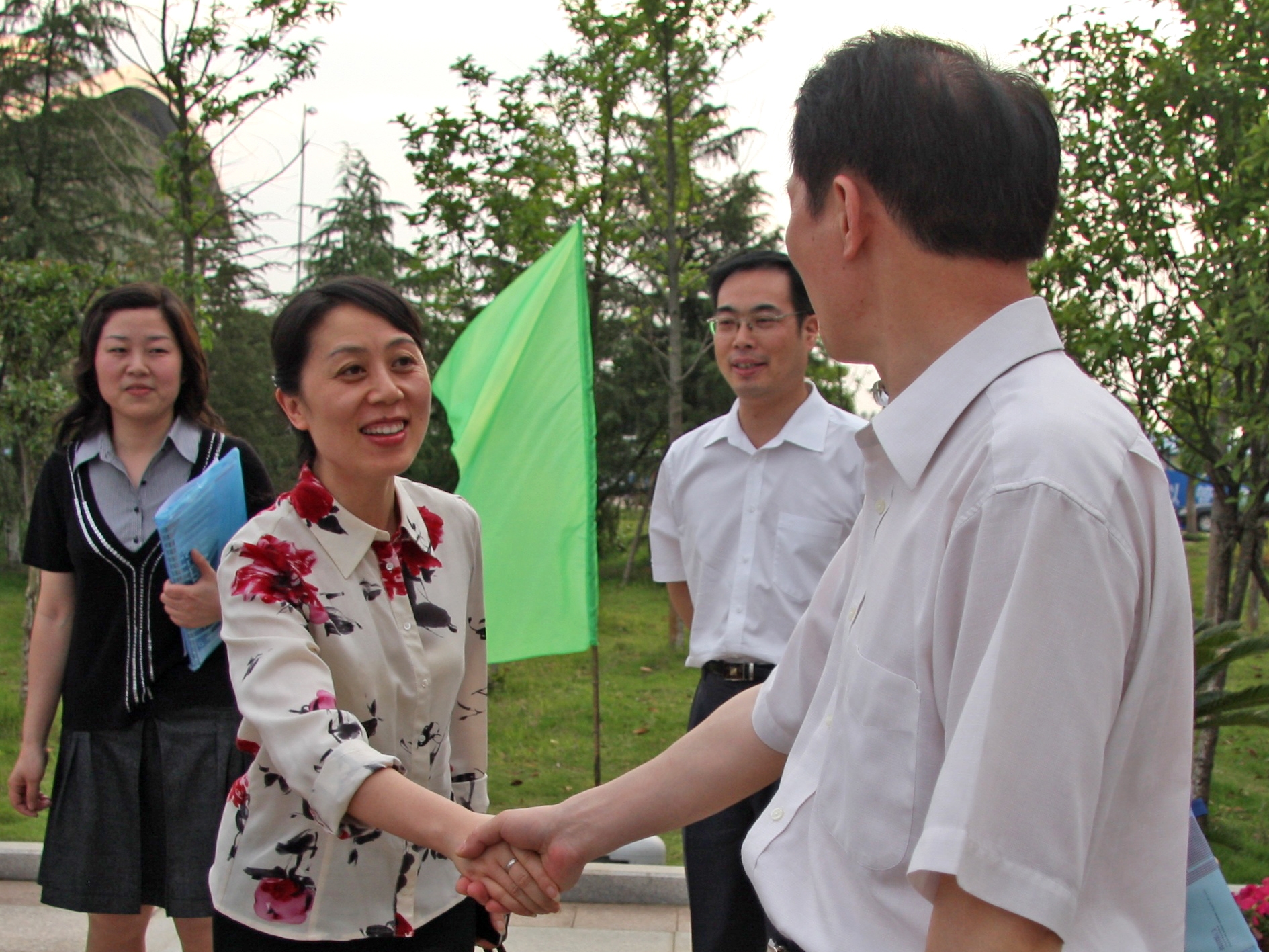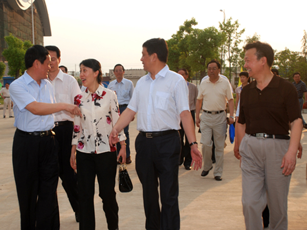 陈安丽厅长(左二)与武汉市副市长岳勇(右二)、市教育局局长谢世腰(左一)、pg电子官网院长张元树(右一)在校园内。