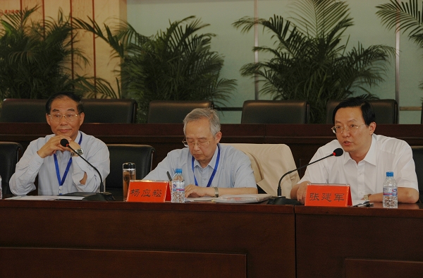省教育厅高教处处长张建军、专家组组长杨应崧、副组长范国强在通报会上。