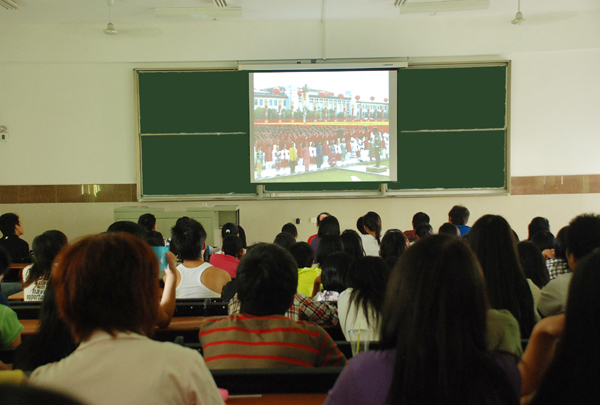 当胡锦涛等党和国家重要领导人出席在天安门城楼上,所有的多媒体教室都不约而同地响起了一片掌声。鲜艳的五星红旗伴随着《义勇军进行曲》冉冉升起,投6教室的同学们不由自主的站起来高唱国歌。三军列阵,铁甲生辉。随着主持人的解说词而出现的一支支部队方阵,引起了教室一片惊叹赞扬之声。高端精锐的军事设备,英姿飒爽的战士们,一支支有着光荣历史、英雄事迹的部队,天安门围观着的群众激动兴奋,在场观看仪式的同学们脸上也激情飞扬。蔚蓝的天空,一列列银鹰呼啸而至,“哇,太壮观了”在场同学情不自禁的赞叹。