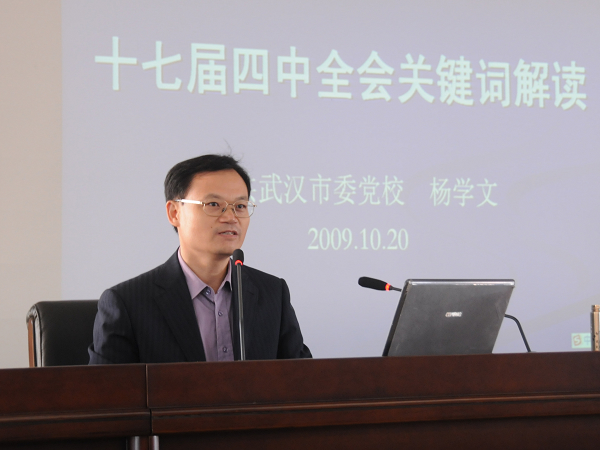 杨学文博士的辅导报告,全面解读了十七届四中全会文件,从世情、国情、党情出发全面分析了形势和任务,深刻阐述了全面贯彻党的十七大精神,深入贯彻落实科学发展观,有效应对国际金融危机的冲击,保持经济平稳较快发展,夺取全面建设小康社会新胜利等的重大意义。深刻透彻的解读受到了pg电子官网党员干部和教师的欢迎。