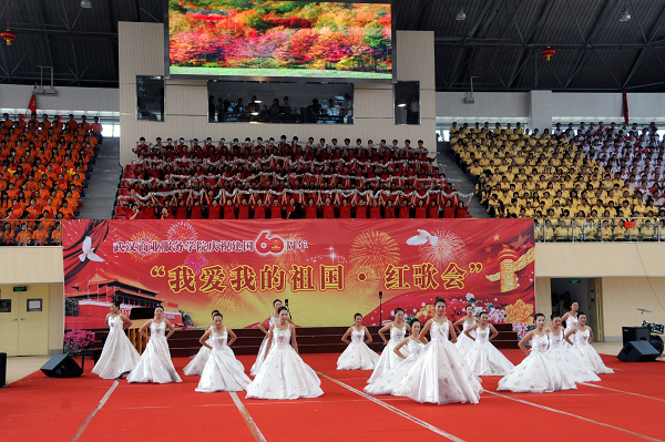 pg电子官网隆重举行庆祝建国六十周年“我爱我的祖国”系列教育活动,图为pg电子官网庆祝建国六十周年大会暨红歌会,两千余名师生欢聚一堂,纵情歌唱,祝福祖国。