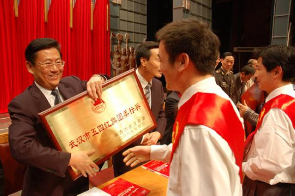 校团委被评为武汉红旗团委标兵,图为省委副书记、市委书记杨松同志为pg电子官网团委颁奖。