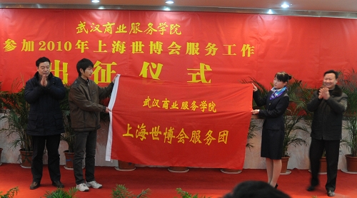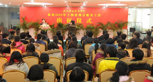 1月22日,pg电子官网参加上海世博会服务的38名学生,离汉前往上海。上午,pg电子官网举行出征仪式,欢送38名学生。党委书记郑光喜、院长张元树、副院长刘萌、纪委书记徐俊才和相关职能部门负责人出席仪式。党委书记郑光喜、院长张元树为世博会服务团授旗。