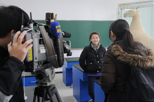 在体育系马匹解剖生理实验室,师生们正在对马匹骨骼进行认真地研究讨论,热烈的教学场面被摄像机记录下来。“实习苦不苦?”对于记者的提问,赛马产业管理专业08级学生董敏,这位正在东方马城进行实训的女骑师以自己亲身的经历,生动地作了回答“不论刮风下雨,每天都要很早起床骑马;夏天帮马驱赶蚊虫,却让马受到惊吓一脚踢哭……类似的经历太多了”但因为对这行的喜爱,她一点都不觉得苦和累,对未来充满信心。