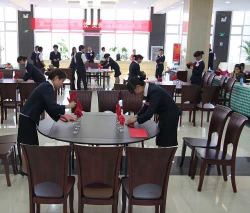 据旅游系负责人介绍,本次比赛在赛场上,还设置了餐巾花、宴席台面、鸡尾酒展区,让更多的同学能够感受到旅游系学生的职业风采。