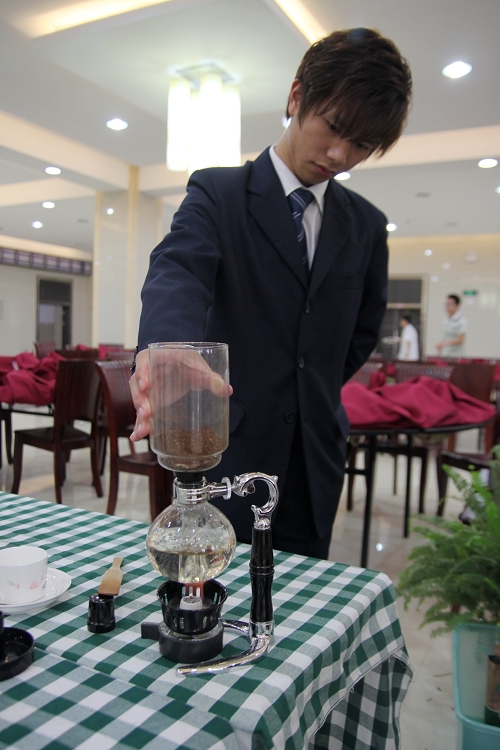 随后,摆台、折花、煮咖啡等环节陆续展开,五花五鸟在选手巧手下显得栩栩如生,大家赞叹连连,纷纷拿出手机拍照;对于大家不太熟悉的煮咖啡环节,不少同学走进比赛桌前,嗅着咖啡幽幽的香味,琢磨着煮咖啡的技巧。
