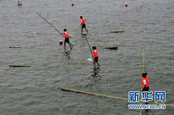 表演现场,只见学生们赤足站立在一根长8米、直径15厘米的竹筒上,手持一根长5米、直径仅4厘米的细竹竿做桨,在湖水中破浪、直行、转弯,单人漂、劈腿漂、弓步漂、翘竿漂等,岸边观众啧啧称奇。