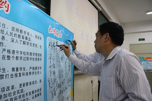 6月10日,是学校的“爱生日”。南区投八教室,党委书记郑光喜同志在信息工程系“爱生公约”上带头签下了名字。在机电工程系,院长张元树同志亲手切开生日蛋糕,送给了过生日的学生。校领导纷纷来到系部,与教师们一起参加爱生活动,校第四届(2010年)“师德建设月”活动掀起高潮。