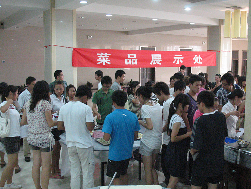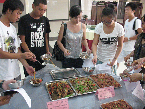会上向受聘的伙食监督管理员颁发聘书,佩戴胸牌。座谈会后,后勤集团饮食服务中心按照食堂日常饭菜的标准,分别按1元、2元、3元、4元、5元的价格,做出了20多种菜肴,邀请与会师生代表现场品尝评分。