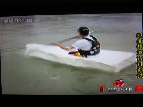 的确很佩服这个王璐瑶啊,确实是太厉害了,很具有冒险精神,整个这个纸船就是这样,万一这底下碰到树枝,或者尖利的石头,一下刮破,这水呼噜呼噜就进去了,而且纸的本身它就不是特别能够耐潮湿,像这个纸整个软了,这船可就解体了,不过王璐瑶同学啊,在这个冒险精神的鼓舞之下,还是对自己的这条纸船充满了信心,觉得在汉江里转一转,已经不过瘾,他准备选择长江了。