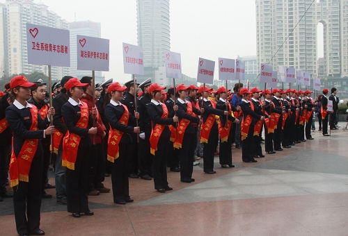 本网讯 近日,共青团武汉市委开展的“创先争优当先锋,环境改善我给力”青年志愿者示范承诺暨志愿服务行动启动仪式,在汉口西北湖广场举行。校团委组织120名青年志愿者参加。