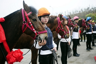 捐赠仪式结束后,,骑师班的学生骑师们骑着马,在练马场上一展骑术。这个练马场投资60余万元兴建,占地7.9公顷,可为学生提供养马、驯马、遛马等基础训练,而骑乘等专业训练仍在东方马城完成。