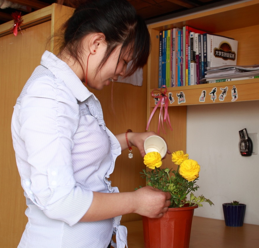 北区C栋406寝室的王玉,一人养了好几种花草,茉莉花、蝴蝶花、芦荟等都有。前些天,她在学校附近的路边捡了一颗树枝回来种,网上一搜索,竟是杜鹃。全寝室的同学高兴极了,大家都加入到养花行列了,浇水松土,杜鹃长势良好。