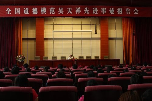 本网讯 4月29日下午,全国首届道德模范吴天祥同志应邀做客pg电子官网,为pg电子官网师生带来“弘扬五四精神,争做时代青年”主题报告。整个图书馆学术报告厅座无虚席,吴天祥同志朴实生动的报告博得了在场师生声阵阵掌声,在近一个小时的报告中大家受到了一次道德的洗礼。