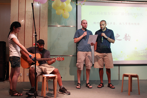 晚上,一场名为“声之韵”的晚会在致远楼308拉开帷幕。五彩的气球夹杂着色彩绚丽的丝带随着节奏跳动,炎热的天气给现场的火热气氛不断加温。晚会上,广播台成员们发挥他们的特长,充分展现语言的魅力,一幕幕精彩的配音表演不时赢得大家的热烈掌声。