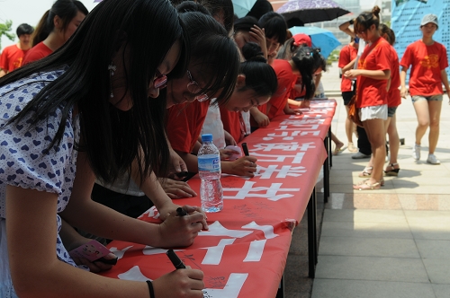 当天中午,致远楼狐形走廊中,旅游系导游协会主办的“读万卷书,行万里路”为主题的“中国旅游日”启动仪式举行。畅言宣传板上,来自各系部的同学纷纷写下自己的旅游心语和梦想。“游遍全世界”、“祝旅游人节日快乐”……数米长的宣传版,满是学子们的留言。