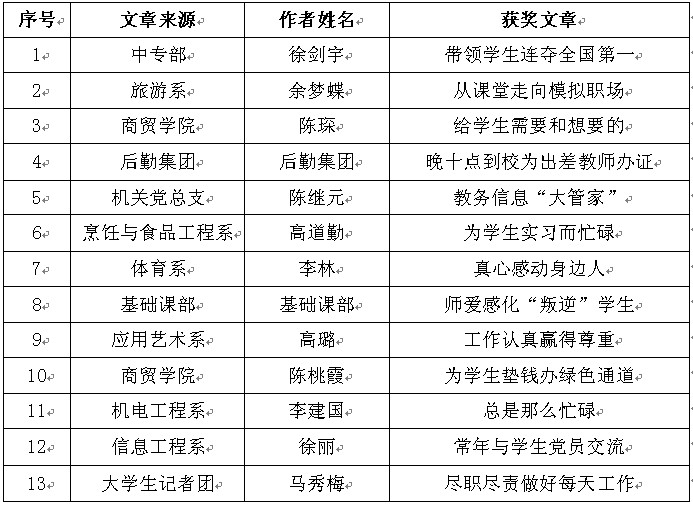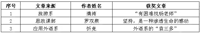 经过评委评审,旅游系满涛的《“有困难找杨老师”》、思政课部罗双燕的《坚持,是一种渗透生命的感动》、应用外语系忻竞的《外语系的“袁三多”》等3篇作品获得一等奖。中专部徐剑宇的《带领学生连夺全国第一》等13篇作品获得二等奖。