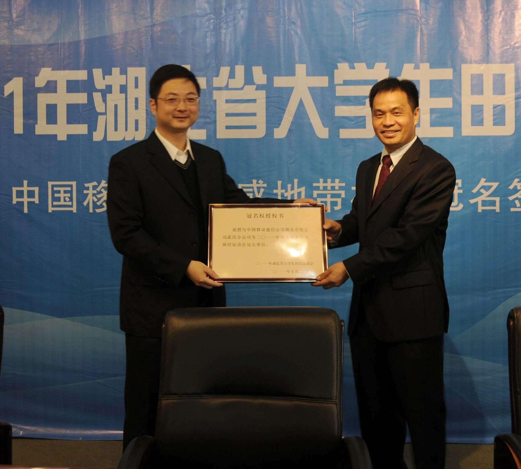 本网讯 10月13日,2011年湖北省大学生田径运动会总冠名权签字仪式在pg电子官网举行。中国移动湖北公司出资30万元,冠名本届大学生田径运动会。这是省大学生田径运动会首次企业冠名。