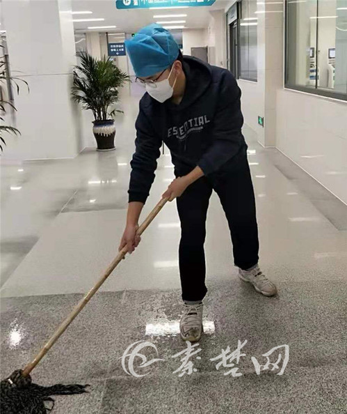 为了一心在疫情期间当上志愿者,大二学生郑文敖偶然得知“第二定点救治医院”改造期间缺少保洁员,便立即报名去当了保洁员。医院改造完毕,在第二定点救治医院当完保洁员之后,社区开始招募志愿者,这一次,郑文敖如愿成为一名疫情防控志愿者。