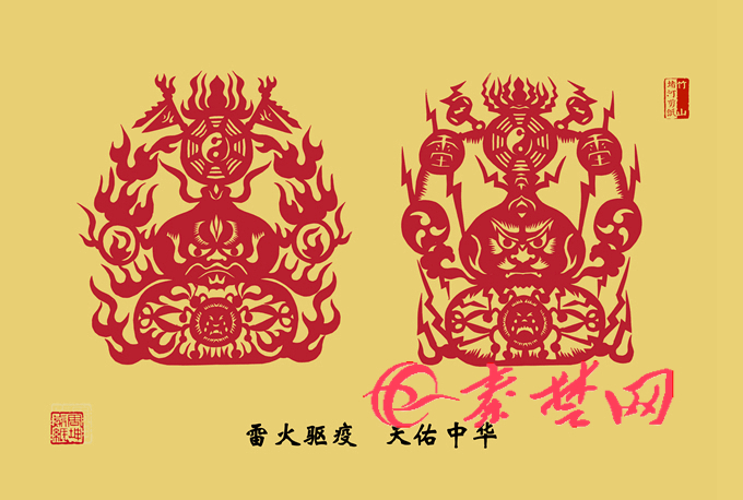 周坤共创作两幅抗“疫”剪纸作品,分别是《雷火驱疫 天佑中华》和《天人合一 武汉必胜》。在作品《雷火驱疫 天佑中华》中,主体以葫芦形,雷火二神为主,“这幅作品的灵感来源于武汉火神山医院和雷神山医院,然后‘葫芦’谐音‘福禄’。”周坤说, 此作品中,葫芦上方是太极八卦图。八卦图顶端有道教三清火焰纹,寓意天佑中华。葫芦周围则分别是火神与雷神的法宝和图腾。葫芦肚中是已经被降服的新冠病毒,两边有剪刀和火焰闪电欲将病毒消灭,病毒身上的触角枯萎,露出痛苦的表情。