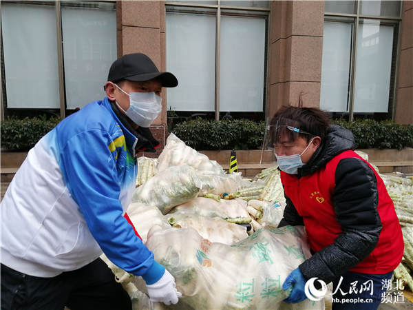 贾翔(左)为居民搬运蔬菜物资