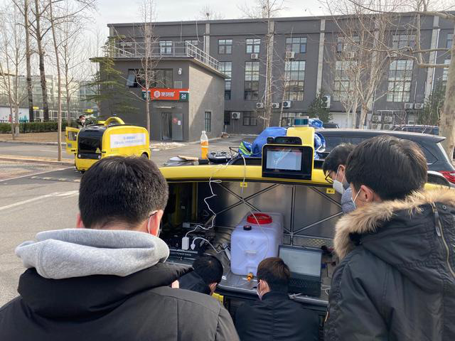 为加大隔离点储备建设力度,武汉科技大学等16所省属高校将作为储备隔离点,交由武汉市指挥部统一调度使用。在兴华教投的协助下,由百度Apollo携手新石器推出的无人智能防疫车,第一时间投入到武汉高校隔离点的疫情防控工作中去。百度Apollo无人智能防疫车以消毒为主,将装备双80L的药箱,一共160L的消毒水,以5km的速度前进,一次作业可长达7.4km,覆盖2.9万平方米。