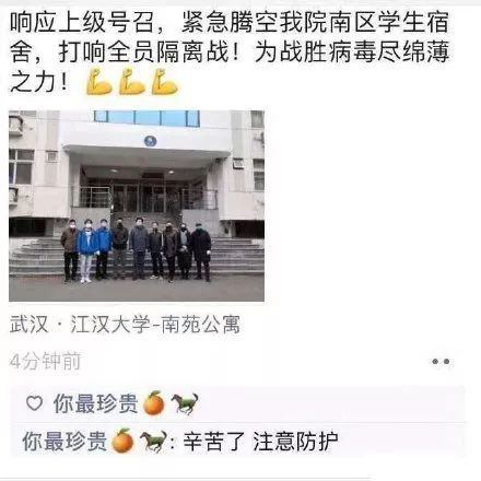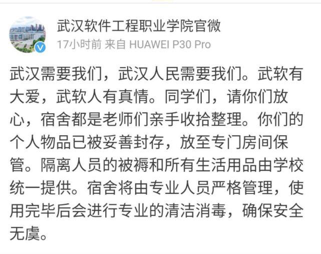 武汉需要我们,武汉人民需要我们。武软有大爱,武软人有真情。同学们,请你们放心,宿舍都是老师们亲手收拾整理……