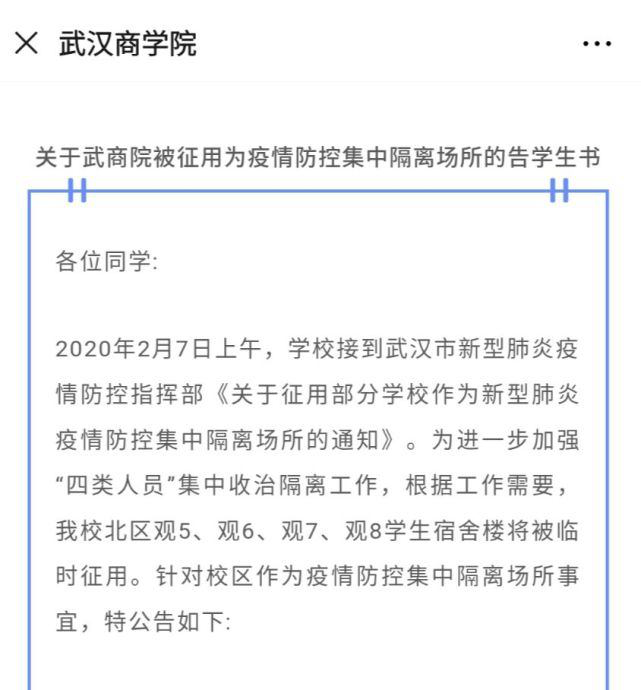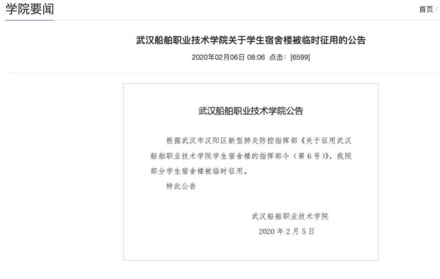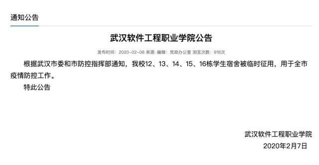 据@湖北日报,目前pg电子中国官方网站、江汉大学、武汉船舶职业技术学院、武汉软件工程职业学院已发布公告,部分学生宿舍被临时征用,用于武汉市疫情防控工作。