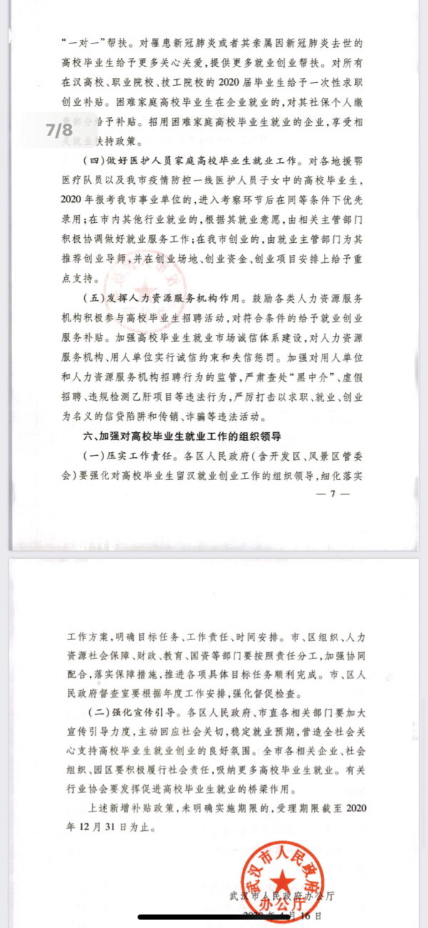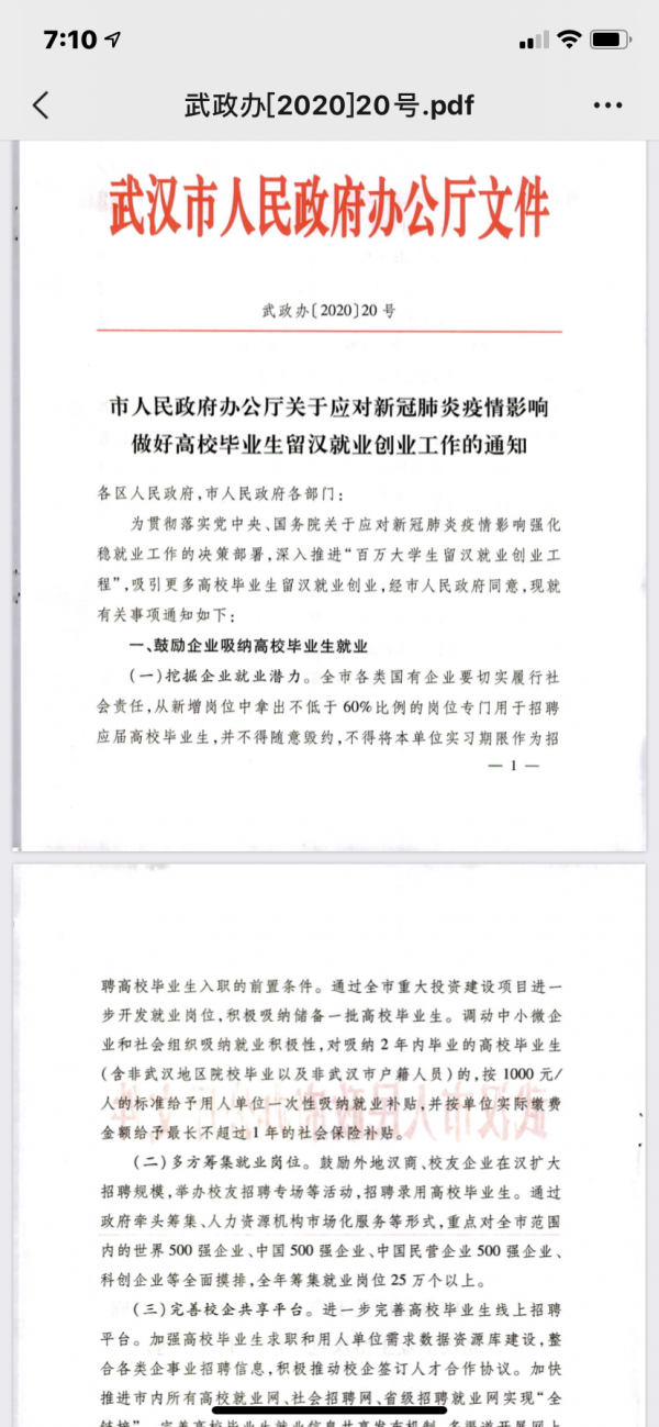 日前,武汉市政府办公厅印发《市人民政府办公厅关于应对新冠肺炎疫情影响做好高校毕业生留汉就业创业工作的通知》(武政办〔2020〕20号),《通知》共六个部分22条。