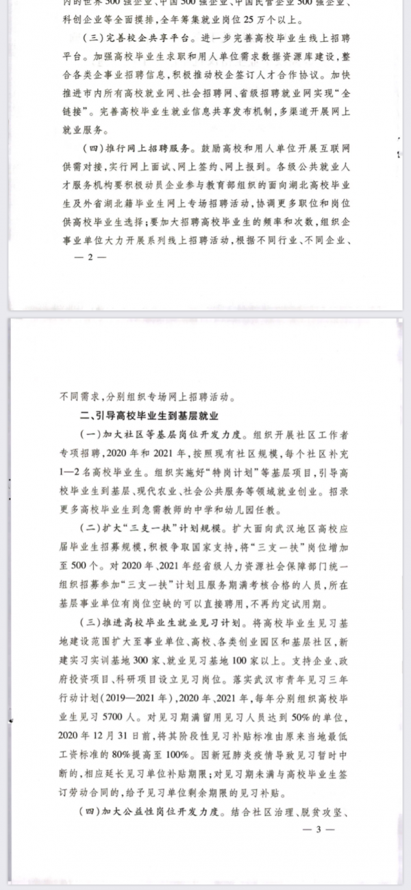 扩大面向武汉地区高校应届毕业生招募规模,将“三支一扶”岗位增加至500个。将高校毕业生见习基地建设范围扩大至事业单位、高校、各类创业园区和基层社区,新建实习实训基地300家、就业见习基地100家以上。支持企业、政府投资项目,科研项目设立见习岗位。落实武汉市青年见习三年行动计划(2019年-2021年),2020年、2021年每年分别组织高校毕业生见习5700人。对见习期满留用见习人员达到50%的单位,2020年12月31日前,将其阶段性见习补贴标准由原来当地最低工资标准的80%提高至100%。