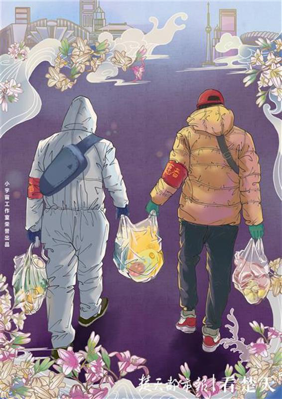 “平凡有大爱,甘做螺丝钉”“国家有需要,党员冲一线”“抗疫第一线,上阵父子兵”……12幅插画里,下沉社区志愿者们为居民值守门岗、分发物资、消杀环境、登记信息的真实场景被一一再现,辅之祥云和鲜花的点缀,满满的治愈感呼之欲出。