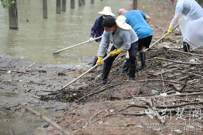 在清理垃圾时,队员袁传启反复提醒大家要注意安全,不要单独作战。“堤坝上很多地方又湿又滑,垃圾大多在水中,稍不注意容易滑到水里。”袁传启抬头看看四周,“这里蝉鸣声、风声、水声都很大,万一有人落水没能及时发觉,后果难以想象。所以一定要团结作战。”1998年,袁传启在汉阳区黄金口堤坝上守着阵地。如今,57岁的袁传启再次出征,把延续了22年的责任和使命传承给年轻一代。