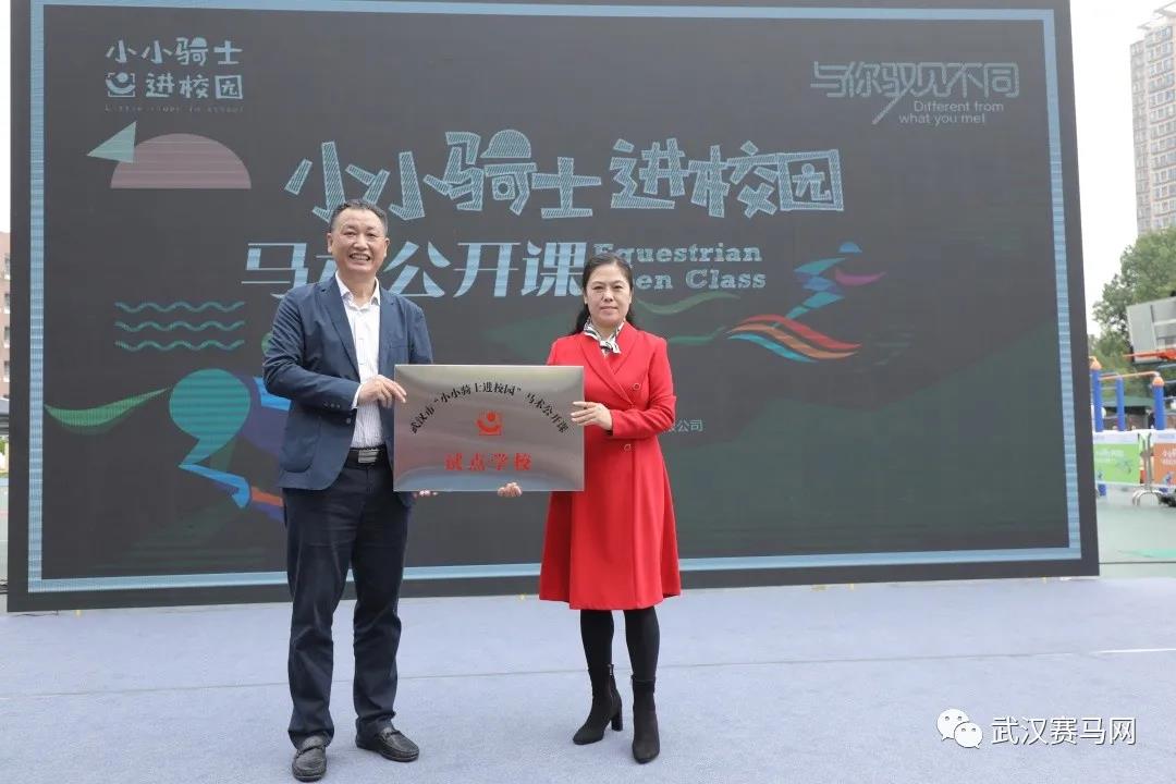 表演结束后,武汉市教育局领导向常青树实验学校校长授予“武汉市‘小小骑士进校园’马术公开课试点学校”牌匾。