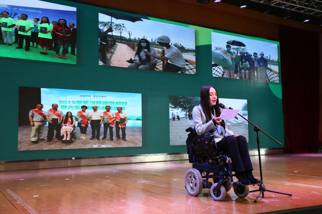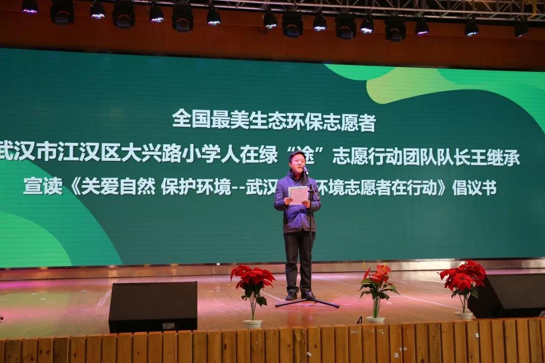 ▲全国最美生态环保志愿者、武汉市江汉区大兴路小学人在绿“途”志愿者团队队长王继承宣读《关爱自然 保护环境——武汉生态环境志愿者在行动》倡议书
