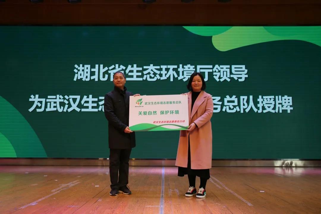 ▲湖北省生态环境厅副厅长万丽华(左一)为武汉生态环境志愿服务总队授牌。