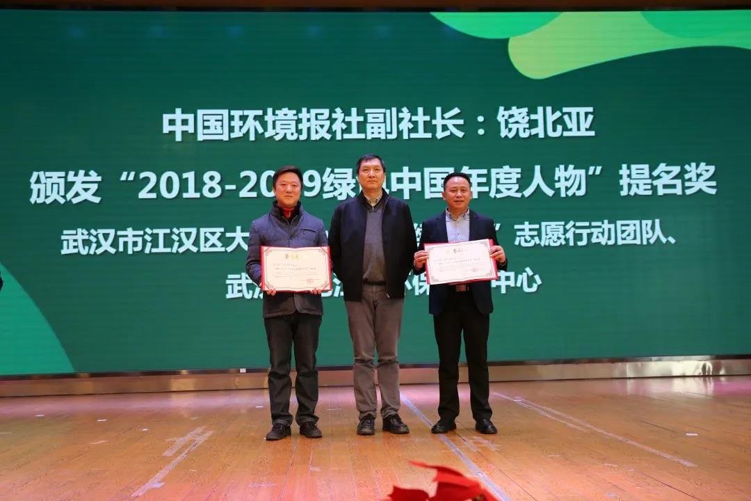 ▲中国环境报社副社长饶北亚(左二)为武汉市江汉区大兴路小学人在绿“途”志愿行动团队、武汉绿色江城环保服务中心颁发“2018-2019绿色中国年度人物”提名奖。