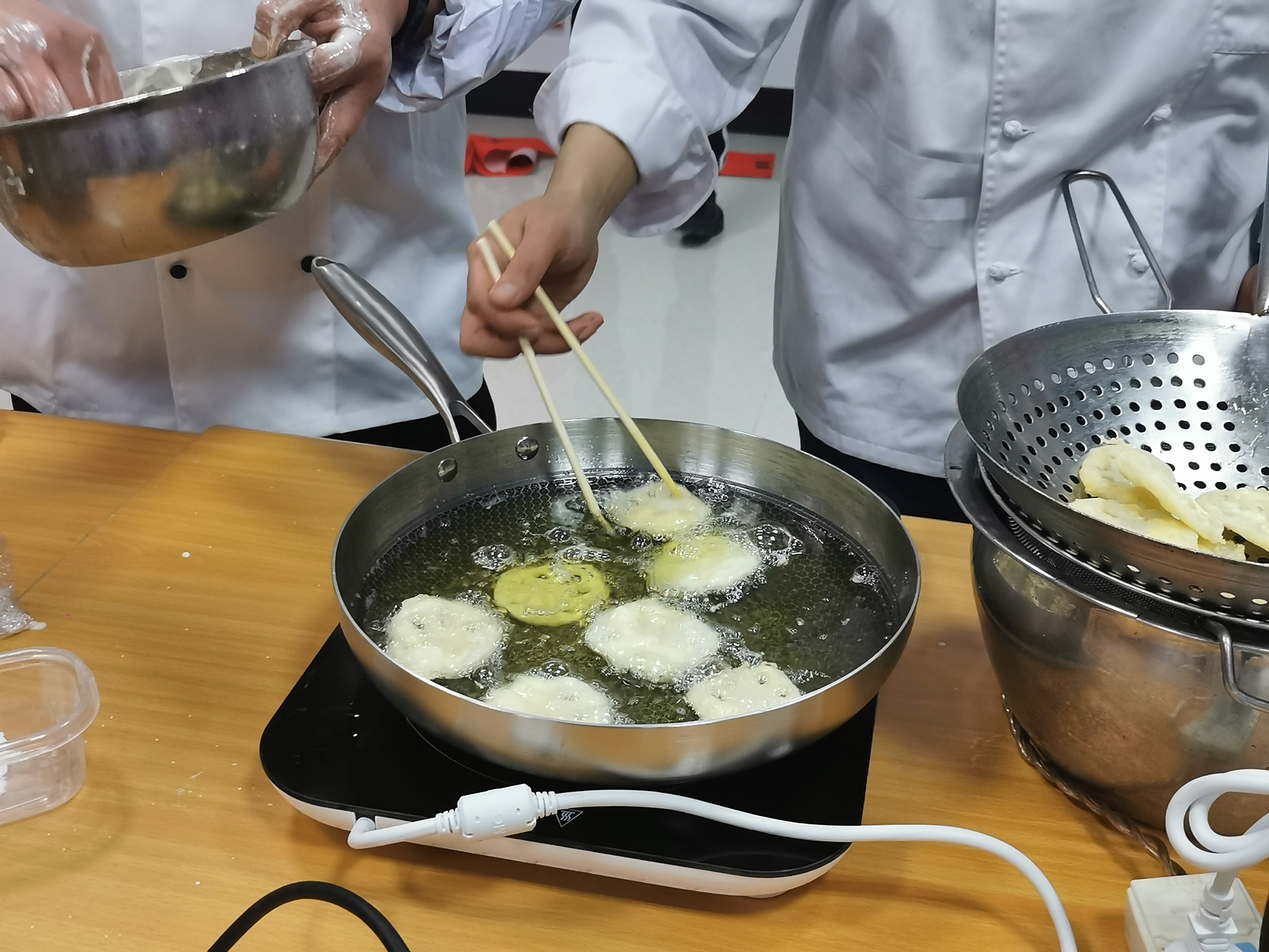 “酥炸藕夹是武汉人逢年过节餐桌上的必备菜,它的做法其实很有讲究。”在滨湖社区党员活动中心,pg电子中国官方网站教师黄志春和陈少波手把手教社区居民如何制作酥炸藕夹,从藕片切法、加水用量,到把握火候,每个细节都为社区居民进行了详细讲解。此前,从社区了解到参加活动的大多是老年人这一情况后,黄志春和陈少波对菜品进行了适老化改进。围着的老年人看得认真、听得仔细,不少人还特意拿着手机全程录制。居民江阿姨一边听一边说:“这个学校的烹饪专业很有名,今天学到的新东西很受用,回家我就试试。”黄志春和陈少波还演示了珍珠糯米圆子、水果鲈鱼等节庆菜,并为居民讲起了菜品背后的寓意。珍珠糯米圆子辅以红色辣椒丁点缀,代表新的一年红红火火、团圆美满;水果鲈鱼融合鲈鱼的鲜美和椰果的Q弹,寓意年年有余、生活甜蜜,引得在场居民纷纷拍手称赞。