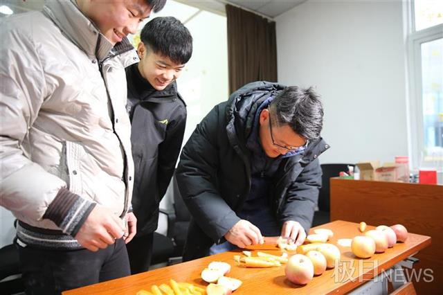 给马儿打理完后,大家又忙着加工马儿的“团年饭”食材——苹果和胡萝卜。“苹果和胡萝卜是马儿最爱吃的食物,每种食材我们都买了十斤,确保马房里11匹马儿都能吃到定制的团年饭。”吴家喆说,为了方便马儿咀嚼消化,所有食材都要提前加工处理。大家用刀将苹果和胡萝卜切成小块,第一次留校的聂宇凡、杨奕辉精心地把食材切割成爱心和花朵造型。