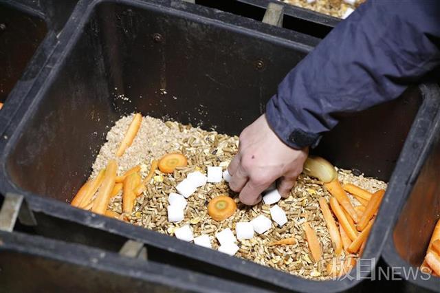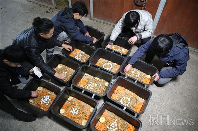 准备团年饭期间,不少闻到香味的马儿纷纷探出头来,靠后的马儿“雅典娜”时不时地踹门,催促着团年饭的制作进程。吴家喆介绍,马儿“团年饭”的主配料由基础饲料和精饲料组成,基础饲料包含麸皮、豆粕、燕麦等成分,相当于人类的米饭,精饲料由玉米片、颗粒粮、油、盐以及一些马匹所需的微量元素构成,相当于人类的各式菜品。在添加了苹果和胡萝卜后,吴家喆和同学们还准备了团年饭的“甜蜜武器”——方糖。“平时只有训练表现好的马儿,才能吃到一颗方糖。”吴家喆说,“今天,每匹马差不多可以吃到八块。”
