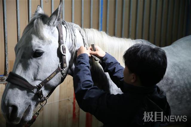 走进马房,极目新闻记者看到,大三学生郑文辉正给马儿“紫焰”编麻花辫。“过年了,马儿们也要漂漂亮亮的。”郑文辉说。虽然是男孩子,但郑文辉编辫子的速度很快,一绺绺麻花辫子让“紫焰”看着精神又喜庆。给马儿们打造过年造型的同时,吴家喆和方子凡从仓库里拿出提前几天清洗干净红色马衣,准备给马儿换新衣,寓意新的一年红红火火。