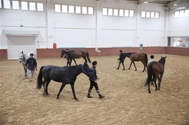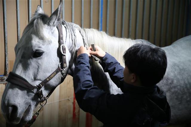 走进马房,大三学生郑文辉正给马儿“紫焰”编麻花辫。“过年了,马儿们也要漂漂亮亮的。”郑文辉说。虽然是男孩子,但郑文辉编辫子的速度很快,一绺绺麻花辫子让“紫焰”看着精神又喜庆。给马儿们打造过年造型的同时,大学生吴家喆和方子凡从仓库里拿出提前几天清洗干净红色马衣,准备给马儿换新衣,寓意新的一年红红火火。