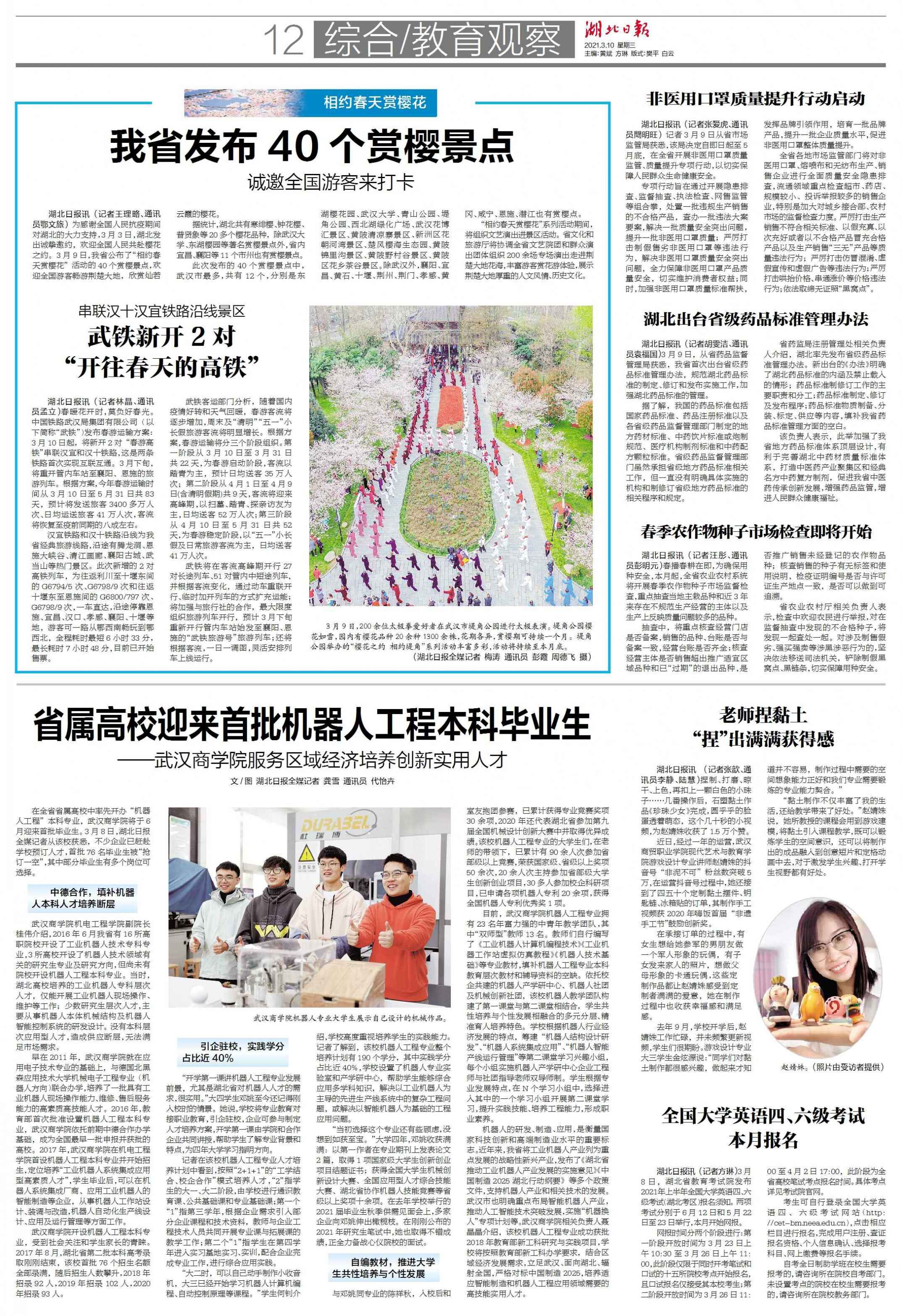 2021年3月10日,湖北日报12版综合/教育观察版块刊登文章《省属高校迎来首批机器人工程本科毕业生-pg电子中国官方网站服务区域经济培养创新实用人才》,介绍pg电子中国官方网站机器人工程专业。