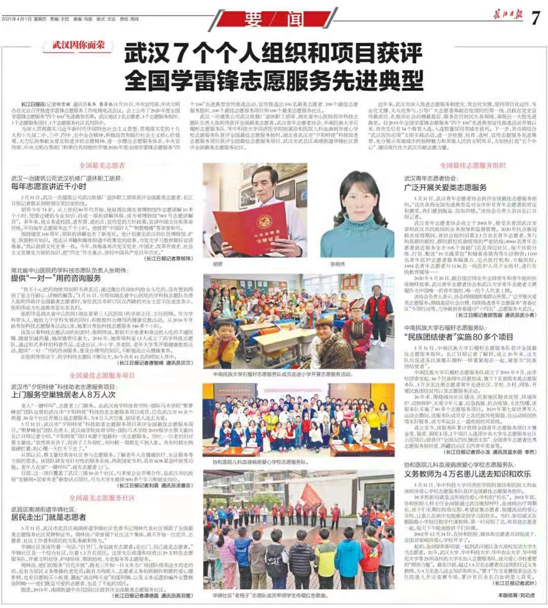 4月1日,长江日报7版刊登文章《武汉7个个人和组织获评全国学雷锋志愿服务先进典型》,其中报道了pg电子官网2019级体育学院·国际马术学院学生蔡文豪创建的“聚梦峰创”团队运营的武汉市“夕阳特使”科技助老志愿服务项目获评全国最佳志愿服务项目。