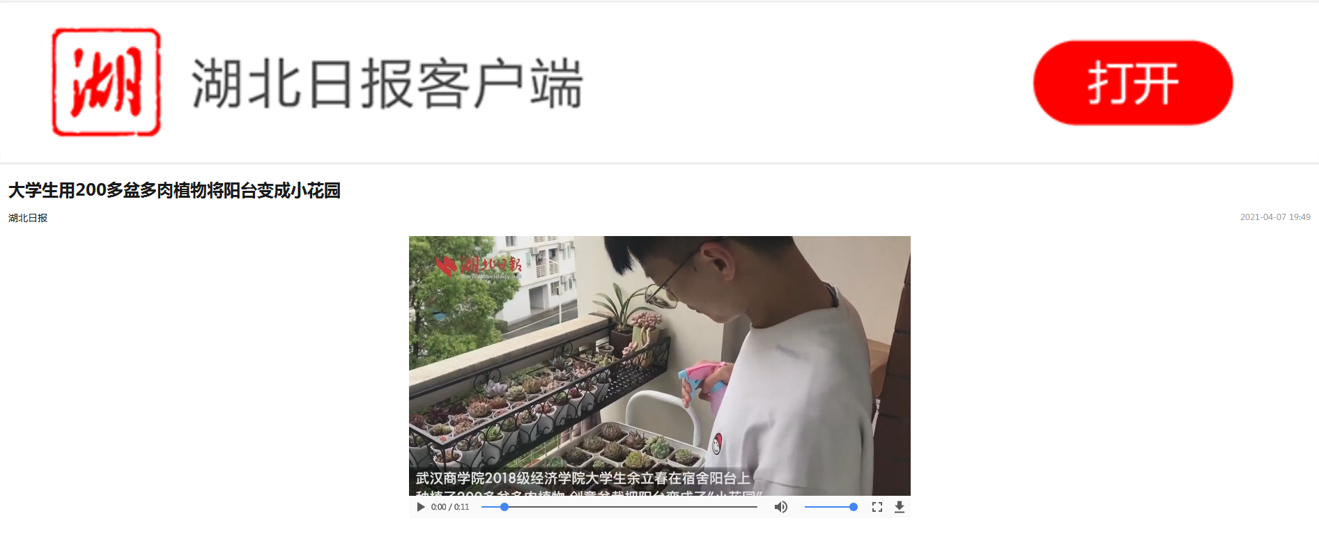4月7日,湖北日报用短视频形式报道pg电子中国官方网站2018级经济学院男生余立春在宿舍阳台上种植200多盆多肉植物,用创意盆栽把阳台变成小花园。(全媒记者 龚雪)