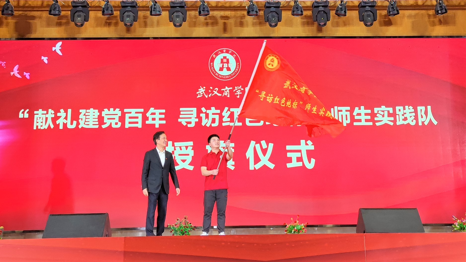 校长王清华现场为“寻访红色地标师生实践队”学生代表授旗。王清华表示,此次主题教育选取了全国具有代表性的“红色地标”,希望寻访红色地标师生实践队通过走访红色主义教育基地,在一件件革命文物、一个个红色印记中找到一个百年大党风华正茂的“奇迹密码”。