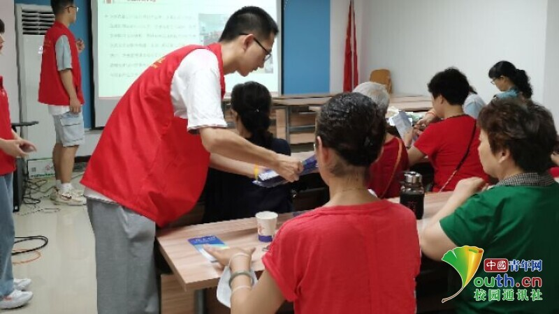 图为志愿者向社区群众纷发实践队的宣传单。