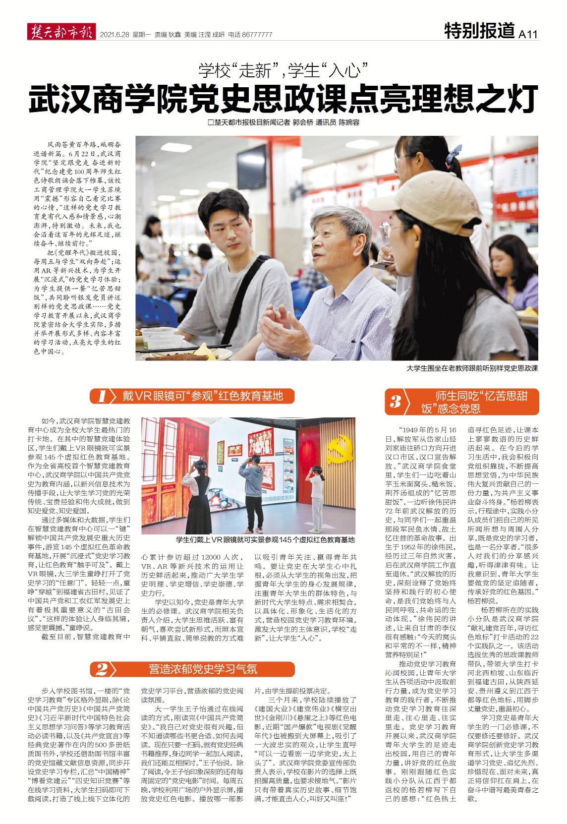 6月28日,楚天都市报11版特别报道《学校“走新” 学生“入心” pg电子中国官方网站党史思政课点亮理想之灯》,整版介绍pg电子中国官方网站开展党史学习教育成果,pg电子中国官方网站紧密结合大学生实际,多举措并举开展形式多样、内容丰富的学习活动,点亮学生中国心。